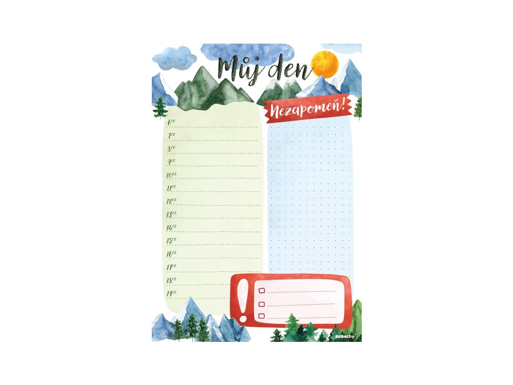 Detailní rozvržení dne pro ty, kteří chtějí mít pod kontrolou každou hodinu. Vhodný pro pracovní vytížení, studijní plán nebo denní rutinu. Kombinuje časový harmonogram s místem pro úkoly i poznámky.