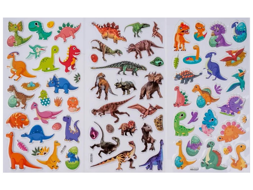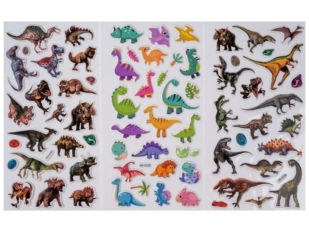 Jedná se o balení 6 archů plastických samolepek s motivem dinosaurů. Každý arch má rozměr 10 x 22 cm. Samolepky mají konvexní tvar, což jim dodává 3D efekt. Velikost samolepek je od 1,8 do 4 cm. Jsou ideální pro zdobení sešitů, deníků, alb, nebo pro kreativní tvoření.