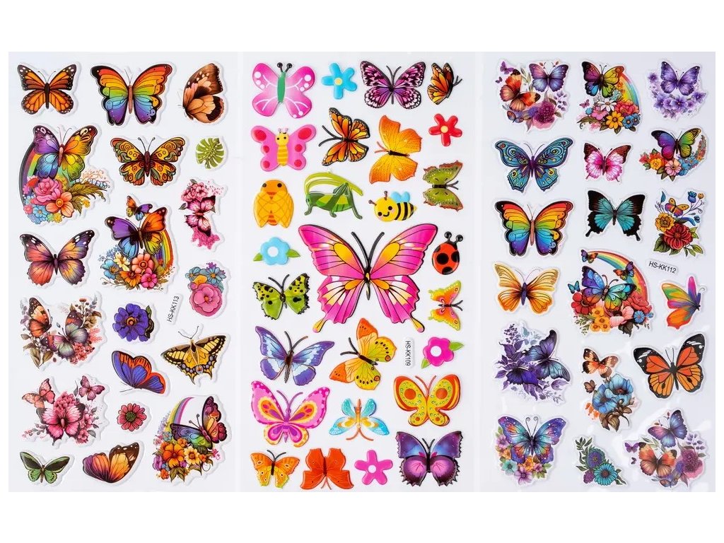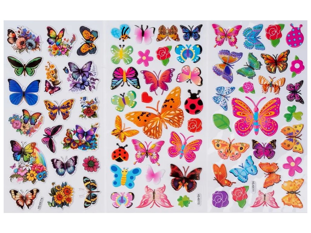 Jedná se o balení 6 archů plastických samolepek s motivem motýlů. Každý arch má rozměr 10 x 22 cm. Samolepky mají konvexní tvar, což jim dodává 3D efekt. Velikost samolepek je od 1,8 do 4 cm. Jsou ideální pro zdobení sešitů, deníků, alb, nebo pro kreativní tvoření.