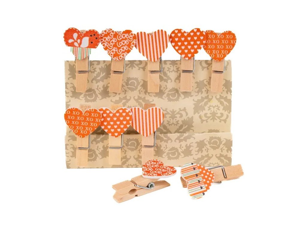 Každý kolíček je vyroben z přírodního béžového dřeva a ozdoben barevnou srdíčkovou aplikací v oranžové barvě s různými vzory jako jsou "xoxo" nápisy, ornamenty, puntíky a proužky. Kolíčky jsou ideální pro dekoraci svatebních oznámení, označování míst u stolu, připevňování fotografií, romantické vzkazy nebo valentýnské dekorace. Kombinace přírodních materiálů s hravými vzory vytváří stylový doplněk pro každou příležitost spojenou s láskou a romantikou.